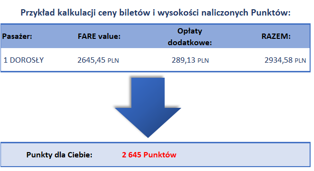 Po zrealizowaniu przez Pasażera lotu oraz usługi dodatkowej, na Twoje konto zostanie dopisane 5 Punktów za każdy wydany 1 PLN z wartośći FARE usługi dodatkowej. Przykładowo, w przypadku sprzedania EMD o wartości 200 PLN, na Twoje konto naliczymy 1000 Punktów.